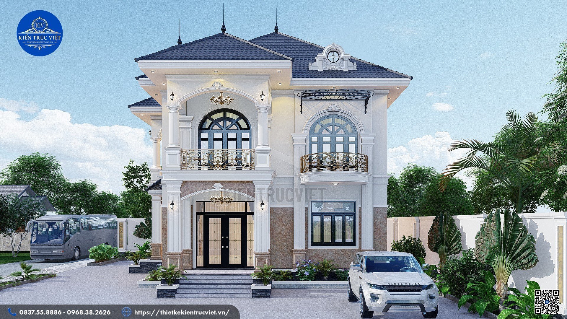 + Màu sắc: Tông màu trắng sứ được chọn làm chủ đạo. Đây là màu sắc "bất hủ" trong thiết kế tân cổ điển, giúp ngôi nhà luôn tươi mới và làm nền hoàn hảo cho màu xanh của mái ngói Fuji cao cấp.